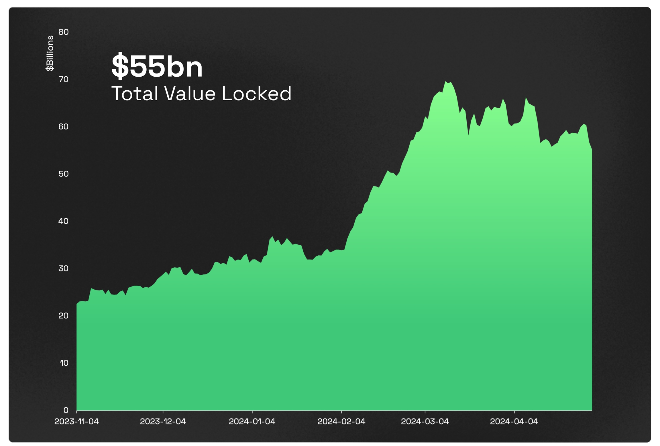 Daily aggregate TVL in LSTs, Token Terminal. As of May 4th 2024.